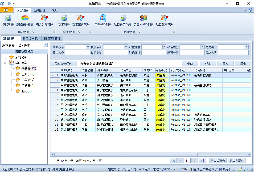 該軟件的功能包括:缺陷的維護管理(可上傳圖片)、項目列表維護、模塊列表維護、版本列表維護(數(shù)據(jù)字典維護(缺陷狀態(tài)、缺陷類型、緊急程度、優(yōu)先級)、用戶及功能權(quán)限管理、機構(gòu)數(shù)據(jù)權(quán)限管理等功能。軟件能夠規(guī)范項目開發(fā)過程中的缺陷記錄跟蹤流程、能夠根據(jù)不同的角色和機構(gòu)分配不同的缺陷,極大提高項目開發(fā)及管理水平。軟件界面美觀大方,方便使用。